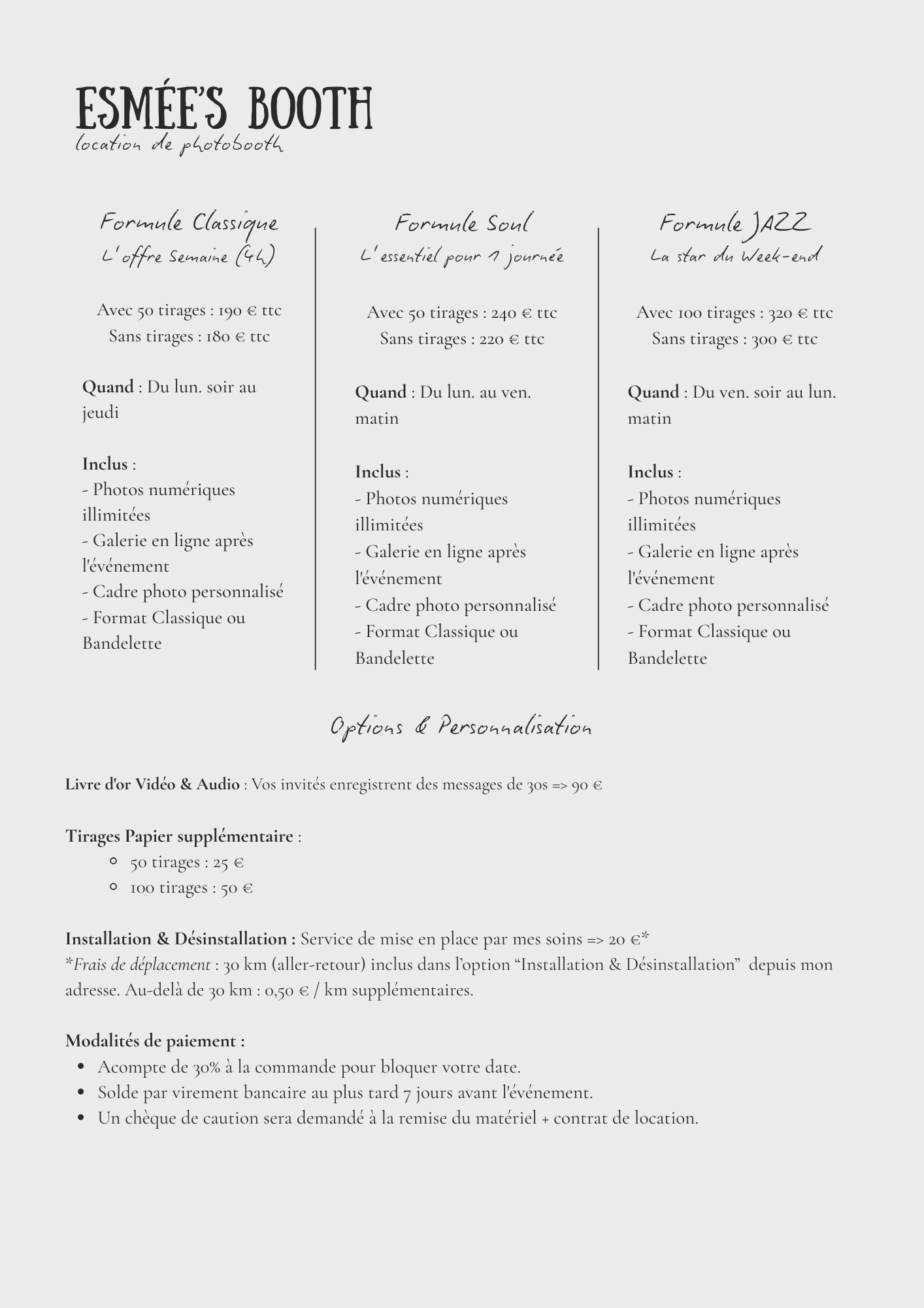 Si je suis disponible à votre date (ou si je ne réalise pas de reportage photo ce jour-là), la location d’Esmée’s Booth est ouverte à tous ! N’hésitez pas à tester votre date via le formulaire de contact.